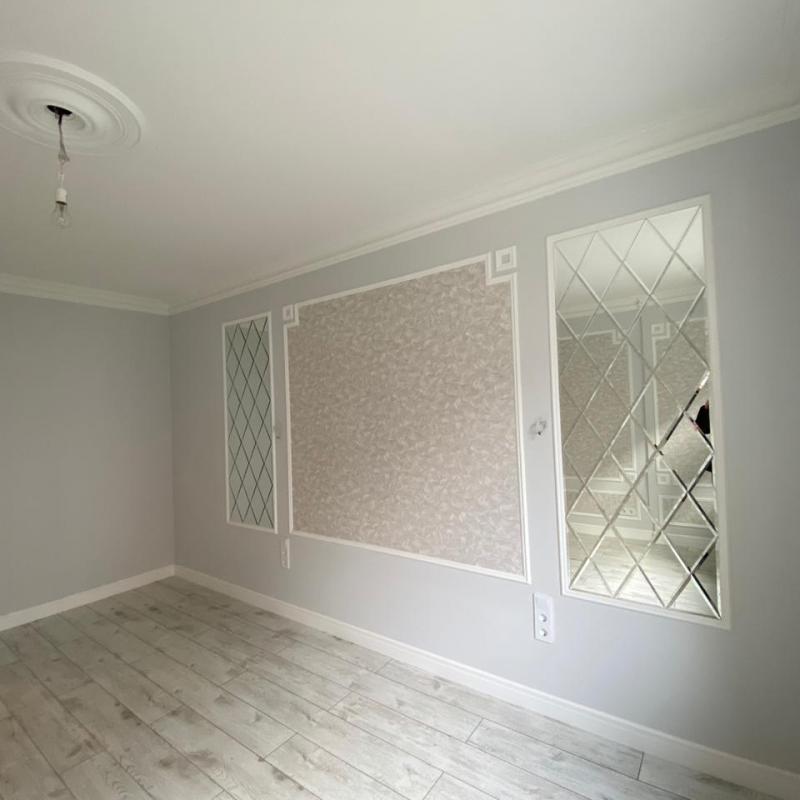 Перед нами интерьер в светлых тонах. О его классическом стиле говорят розетка на потолке и молдинги, использующиеся вместо лепнины. А также зеркала, оформленные в рамы, словно картины.